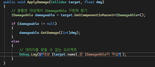 충돌시 데미지 처리 및 몬스터의 죽음은 몬스터 스크립트 쪽에서 해결하도록 하고 BulletManager 쪽에서 총알의 데미지 값을 int로 넘겨주는 방식을 사용했다.