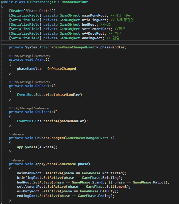 GameManager가 Phase 단계별로 게임의 상태를 구분하기에 UI도 거기에 맞춰 CurrentState에 따라 어떤 UI를 출력할 수 있게 할지 UIStateManager를 두고 관리한다.