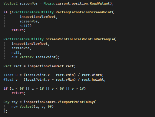 이후 여기서 얻은 u와 v 값을 InspectionCamera의 화면좌표라고 가정하고 Ray를 쏜다.