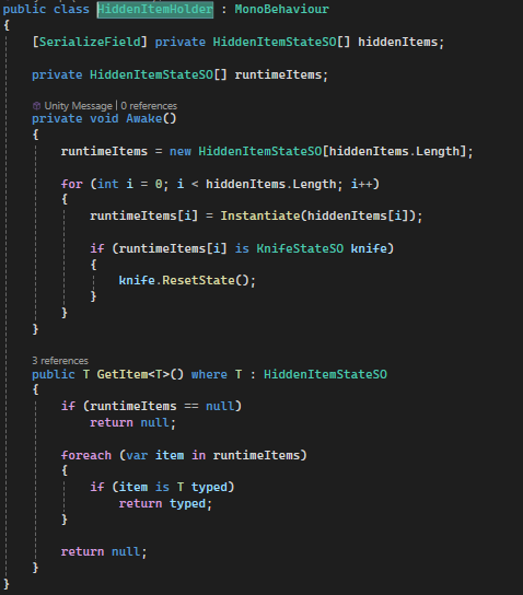 이후 월드오브젝트에 '상태SO'를 담을 Hidden Item Holder 스크립트를 붙여주고 이를 상호작용을 통해 없애면