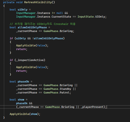 크로스헤어의 경우는 팀원이 만든 Interactable Ray의 정보를 가져와서 게임페이즈에 따라 활성화를 진행한다.