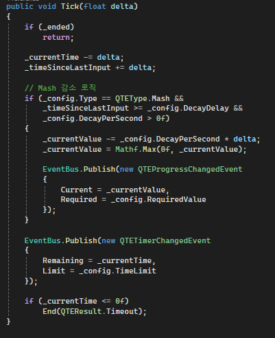 오늘은 어제 만들었던 QTE에 저항성이 별로 느껴지지 않아서 피드백이 좀 더 강하게 느껴지도록 시간에 따른 횟수 강제차감과