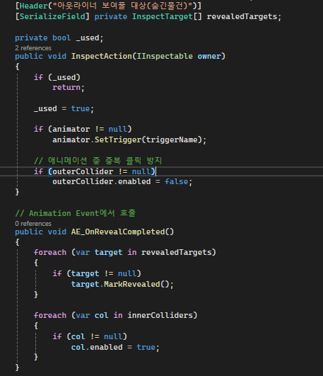 그리고 내부의 숨겨진 오브젝트를 배열로 추가해서 bool값을 통해 보여졌는지를 체크하고