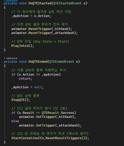 QTE 시작과 종료를 이벤트로 받아서 죄수 애니메이션을 진행하는데 상태에 따라서 결과 애니메이션 출력의 분기를 나눴다.